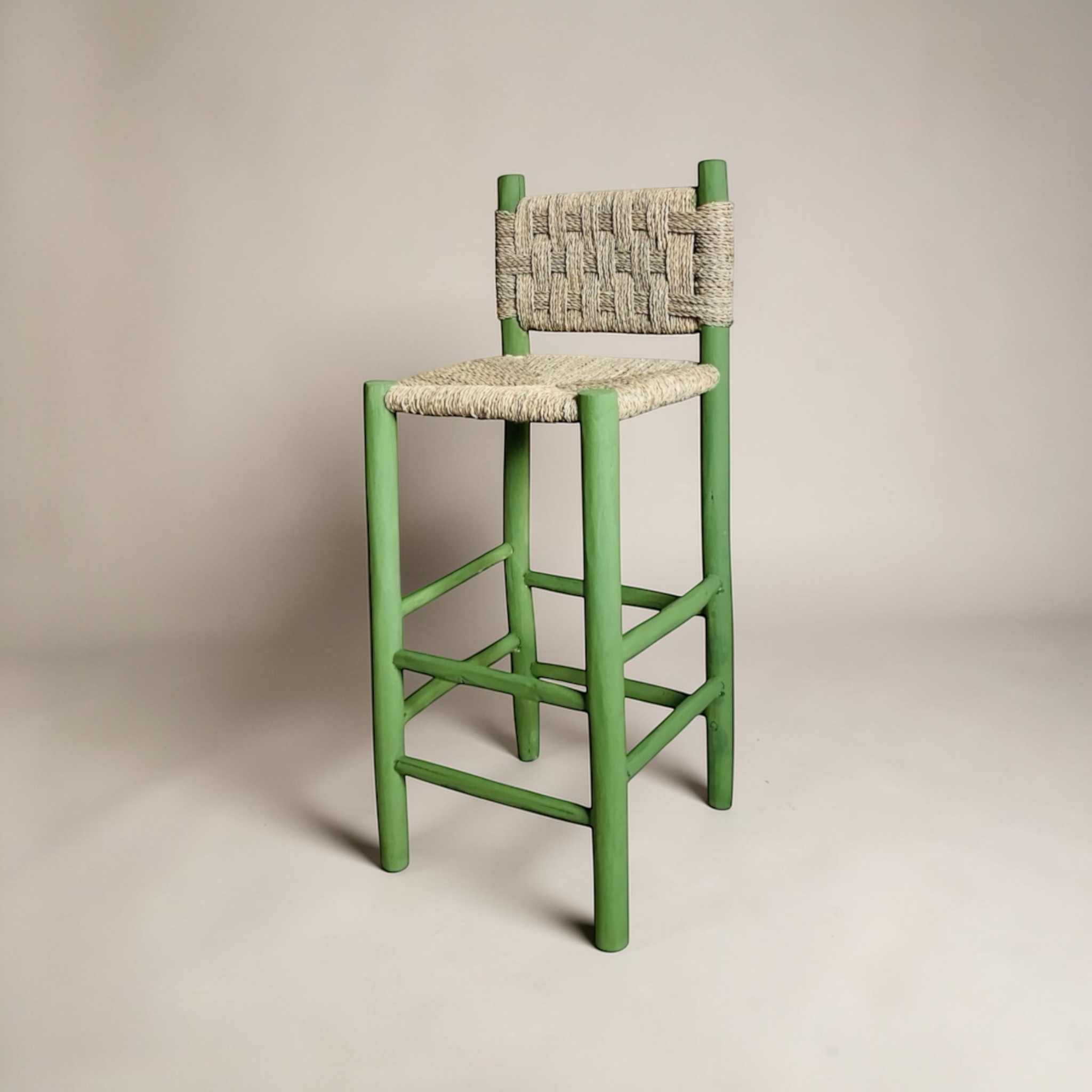 Add a touch of rustic charm and traditional craftsmanship to your space with our handcrafted bar stools. Made entirely by hand in Morocco, our stool features a solid stained wood frame and a carefully woven seat and backrest using natural cord in a bold, textured pattern.