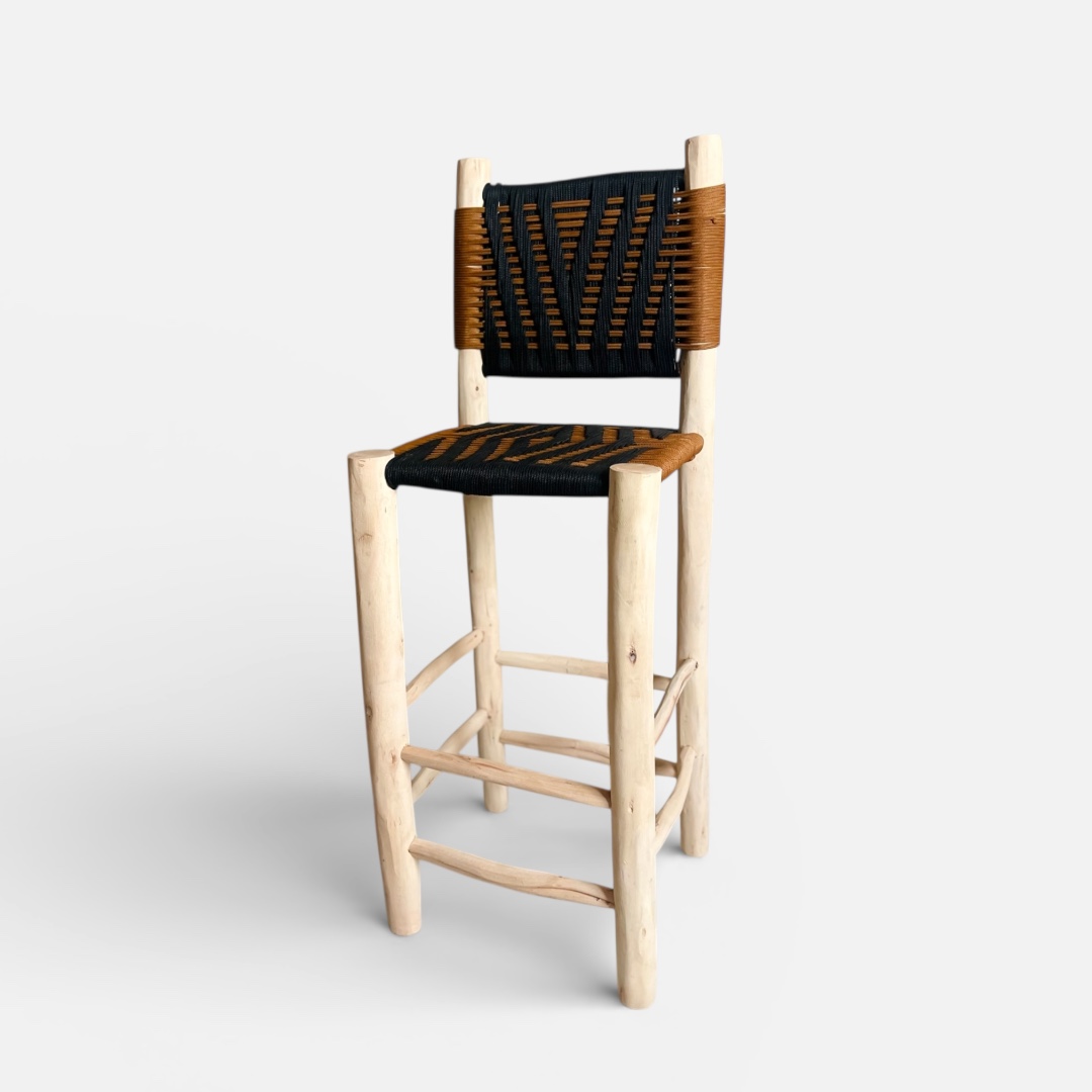 The seat and backrest are handwoven with durable cord in striking black and earthy brown tones, creating bold geometric patterns that add a modern boho touch. Sturdy, comfortable, and full of character – this stool is perfect for stools for kitchen island, breakfast bar and stools, home bars, or statement seating in any room.